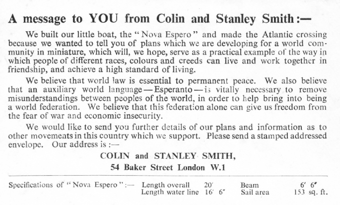 Central to the plan was a series of peace colonies, also called “Nova Espero“, where people of all nations could co-exist in harmony, speaking the universal language, Esperanto, each contributing whatever skills he or she had, to the good of the community. The community was to be strictly governed in accordance with the Sankey Declaration of the Rights of Man – a predecessor of the Universal Declaration of Human Rights – and eventually a world government would be formed. In order to demonstrate both their commitment to the plan, and their skills as craftsmen, Stan and Colin embarked on their mission to build Nova Espero – the boat – and sail her across the Atlantic.